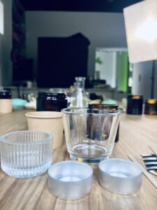 Asortyment związany z produkcją świec. Woski, szkła, knoty